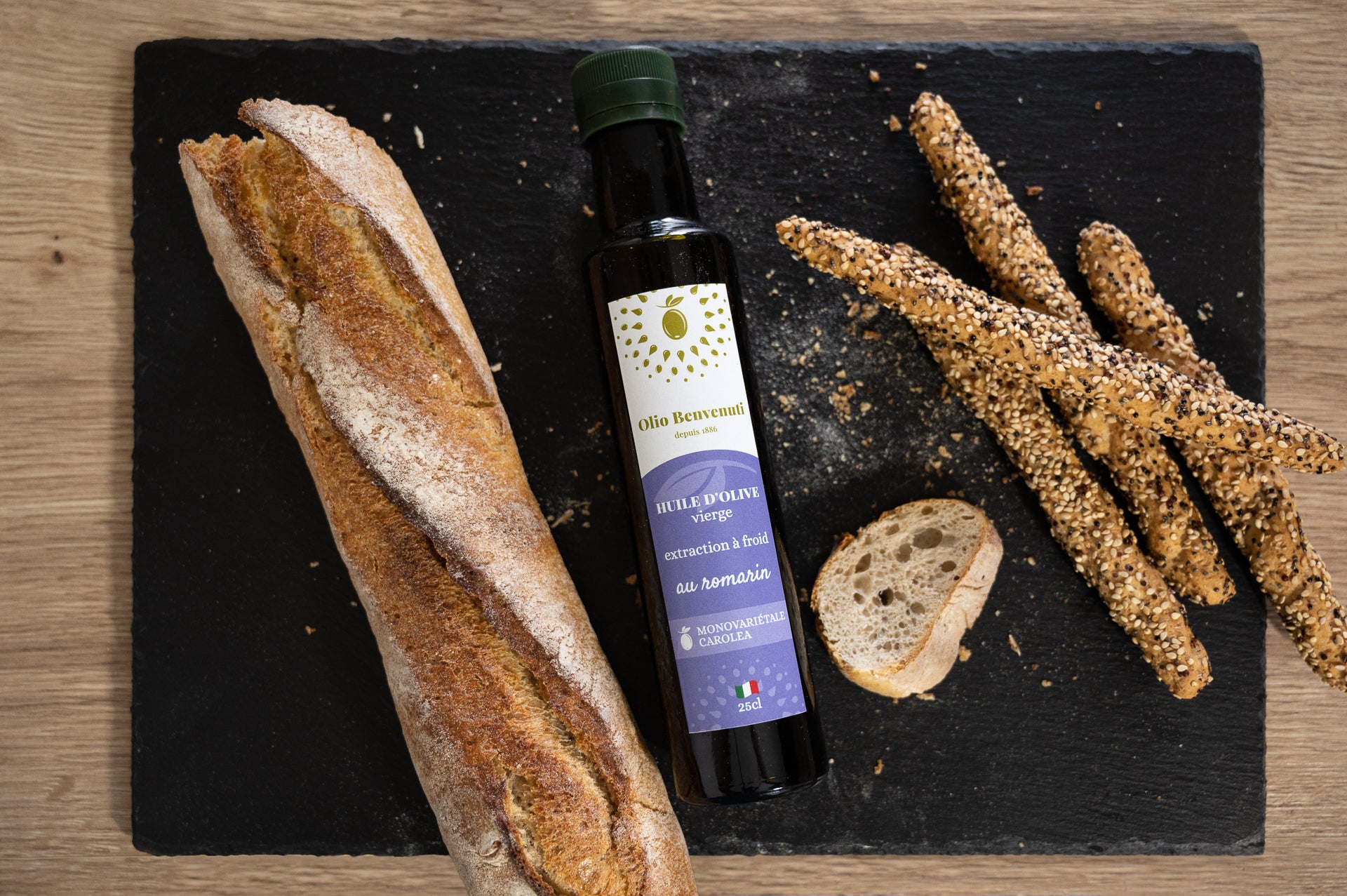 L'huile d'olive vierge non filtrée est infusée avec des feuilles de romarin frais, offrant un arôme boisé et méditerranéen. Parfaite pour accompagner vos viandes grillées, pommes de terre rôties et focaccias, elle ajoute une touche aromatique distinctive.
